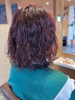 根元の方から強めのパーマをかけて気分が上がるボルドー系のヘアカラーを✨