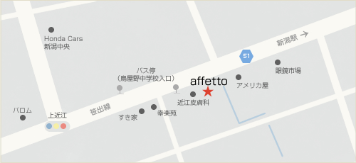 【車でお越しの方】 女池インター下車。DeKKY401を右折し、笹出線を東に直進して下さい。右手にあるフランスベッドの手前にございます。 【電車・バスでお越しの方】 新潟駅バスターミナルの14番線[C1]県庁線に乗車。『鳥屋野中学入口』で下車していただくと、バス停の目の前にお店があります。 |